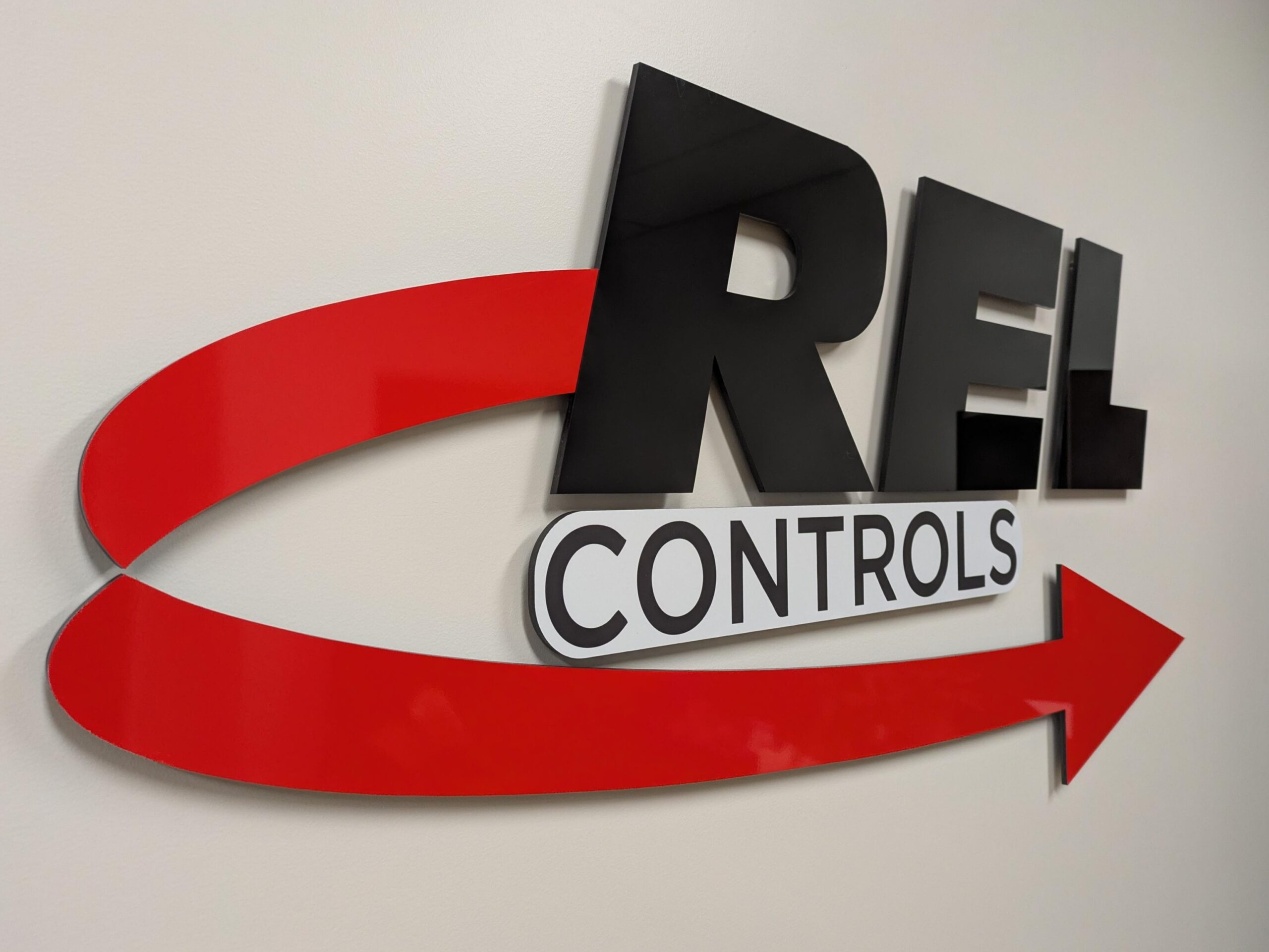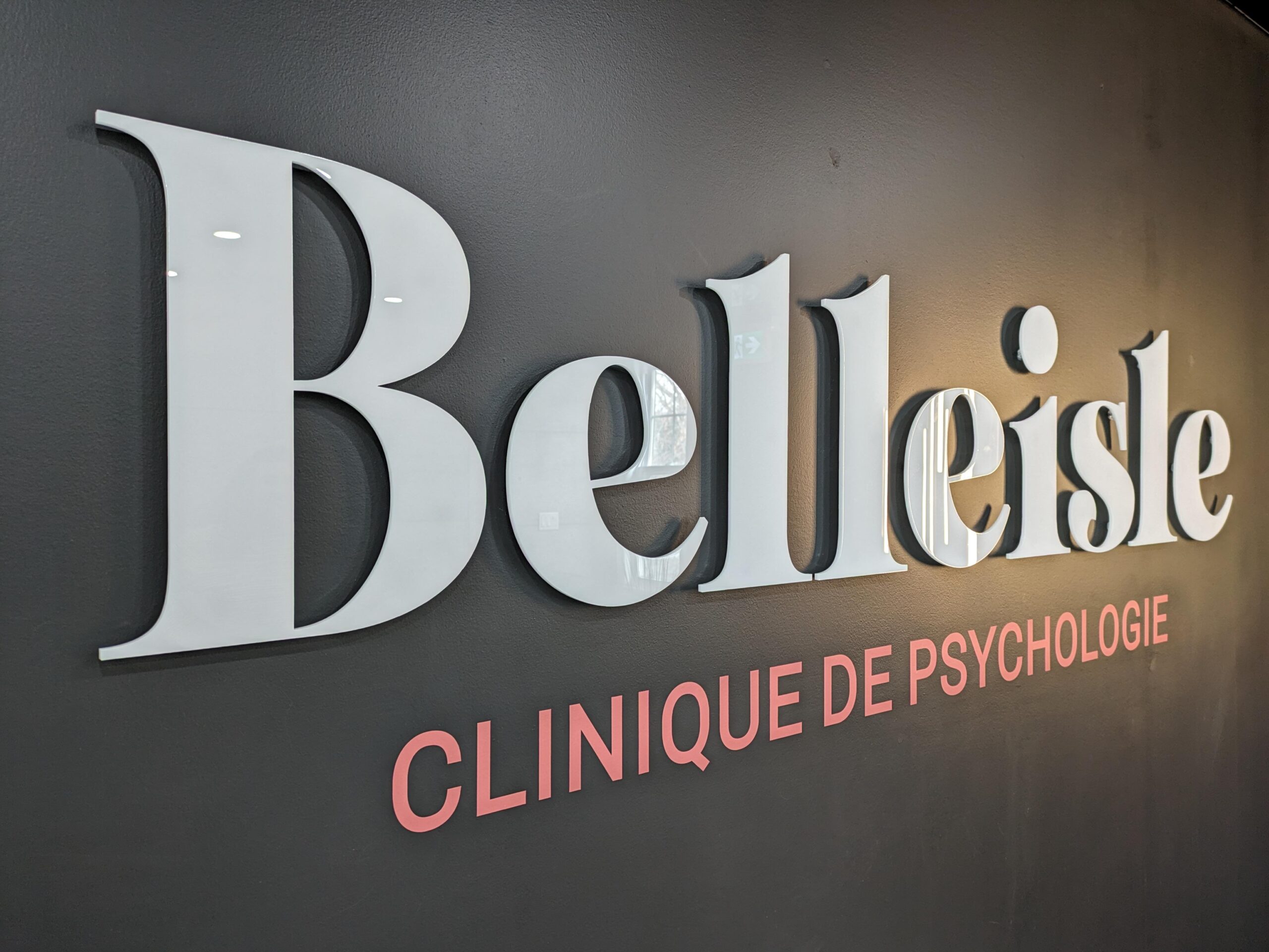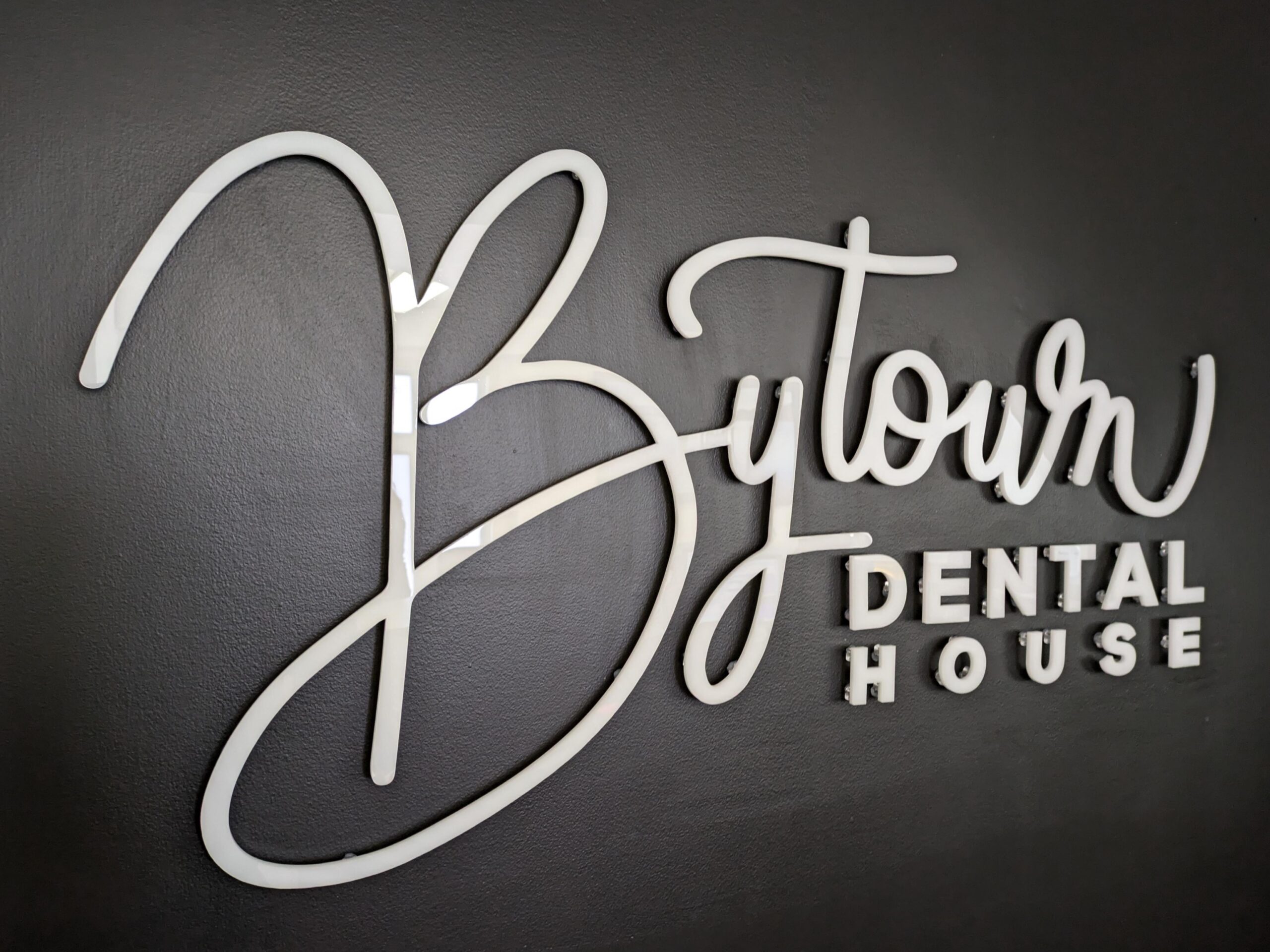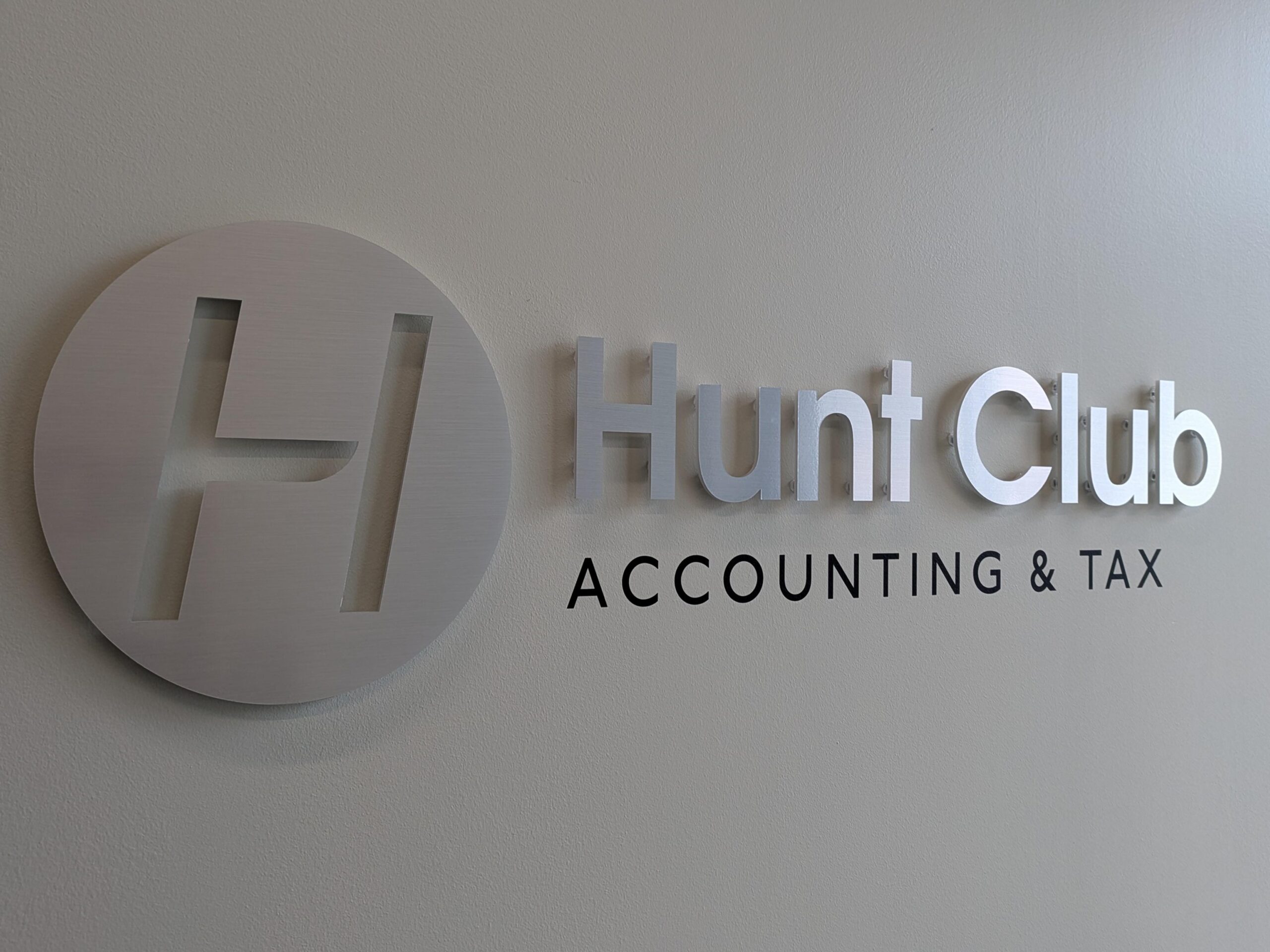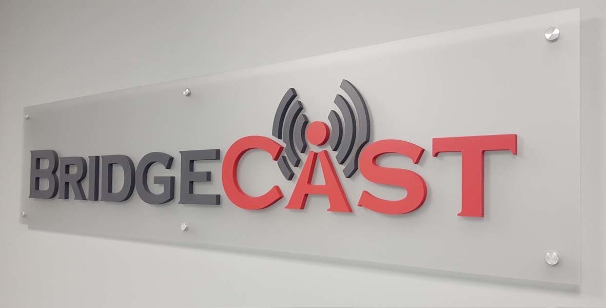 Dimensional letters or logos mounted to walls with pins, adding depth and a professional look.