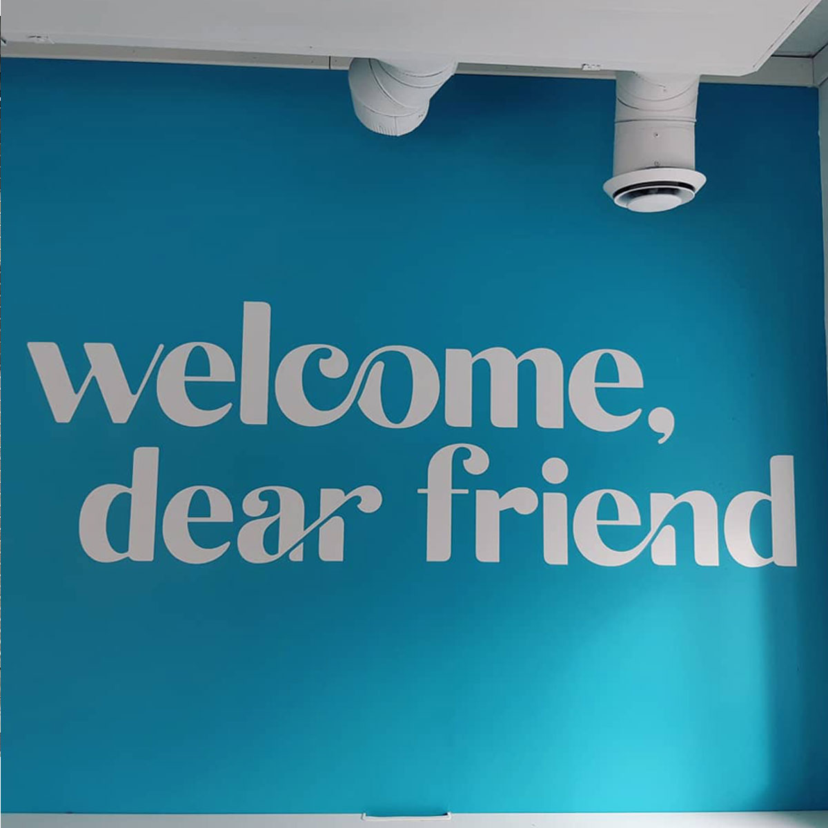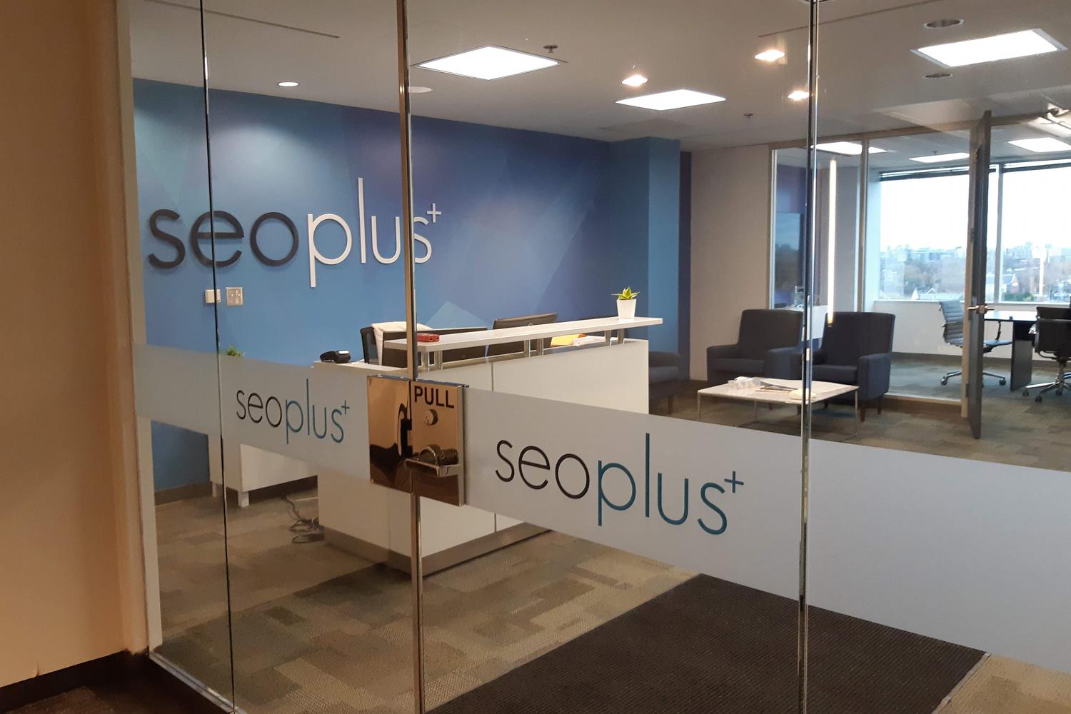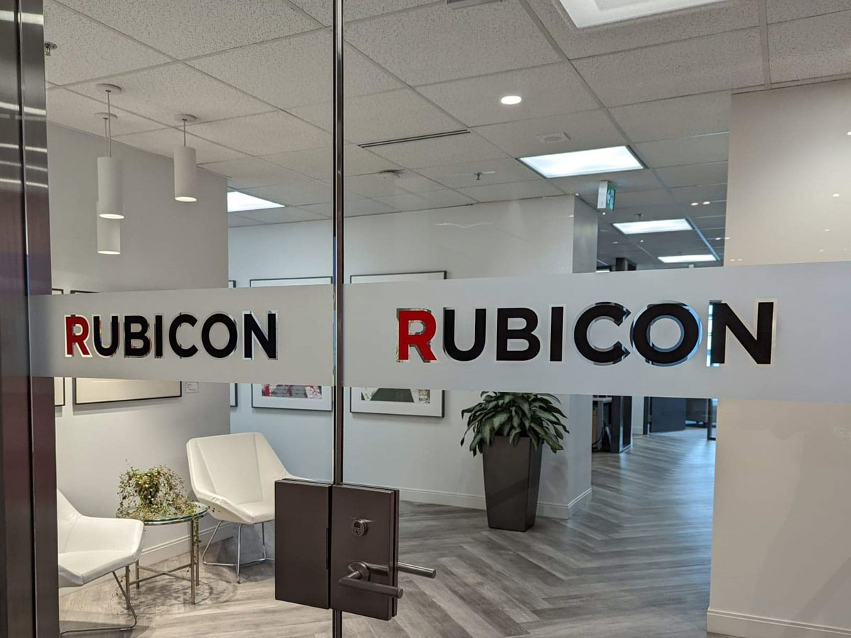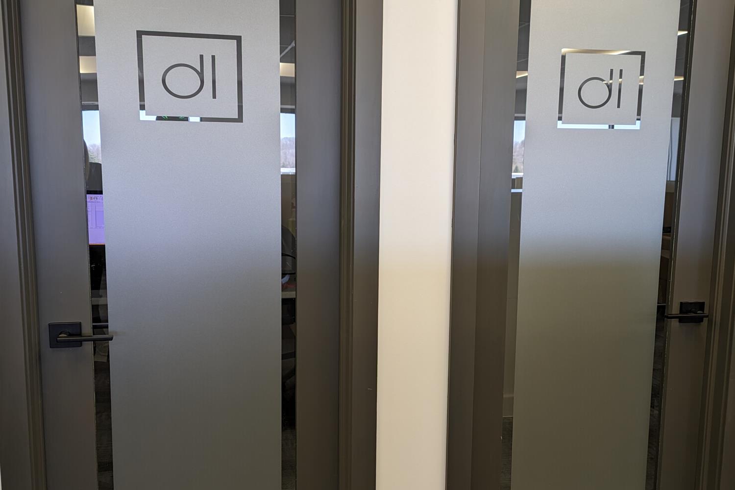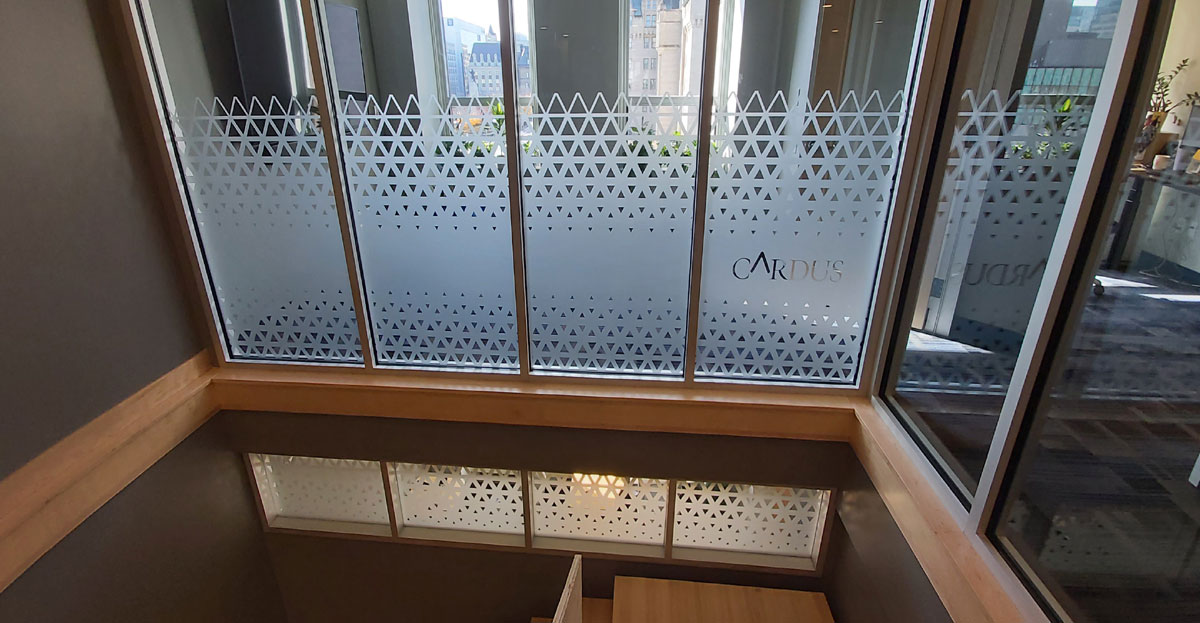 Semi-transparent window film for privacy or decorative branding in offices and meeting rooms.